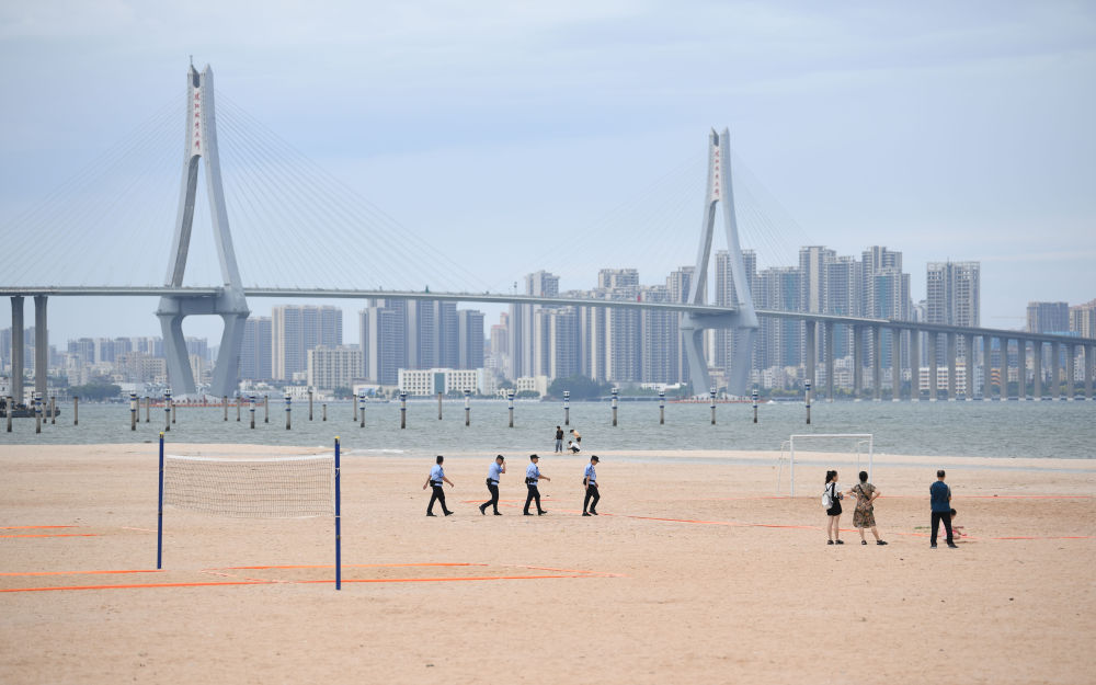 2023年7月17日,广东湛江五环广场的沙滩上,公安民警在执勤巡逻。